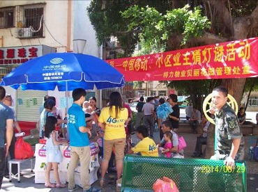 中秋前夕,為豐富小區(qū)居民的業(yè)余生活,增加與小區(qū)居民的互動,特力物業(yè)水貝管理處與中國移動公司一起舉辦了中秋節(jié)猜燈謎聯(lián)歡活動,為小區(qū)居民送上濃濃的節(jié)日祝福;顒赢(dāng)天,貝麗花園文化廣場掛起了彩色謎語條、燈籠,充滿了節(jié)日氣氛,小區(qū)居民、老人、暑期的學(xué)生,紛紛前來參加活動。中國移動公司為參加活動的業(yè)主提供了小禮品;顒受到業(yè)主、住戶的一致贊揚。