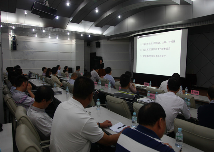 市委黨校孟偉教授受邀擔(dān)任主講。她從當(dāng)前政治環(huán)境基調(diào)、民主政治發(fā)展的主要內(nèi)容和亮點(diǎn)以及積極推進(jìn)深圳民主法治建設(shè)三個(gè)方面對(duì)主題進(jìn)行了全面分析和詳細(xì)解讀,使與會(huì)人員更好、更全面地理解和把握了社會(huì)主義民主政治和依法治國(guó)的核心內(nèi)涵,對(duì)我們接下來學(xué)習(xí)領(lǐng)會(huì)十八屆四中全會(huì)精神和進(jìn)一步推進(jìn)集團(tuán)全面實(shí)現(xiàn)依法治企、依規(guī)辦事、廉潔從業(yè)具有較強(qiáng)的指導(dǎo)性意義。