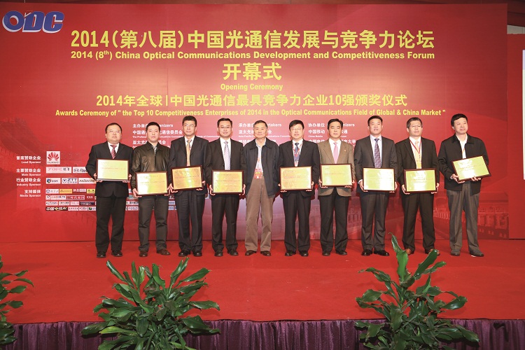 近日,第八屆中國光通信發(fā)展與競爭力論壇暨2014中國/全球光通信最具競爭力企業(yè)10強(qiáng)評選活動頒獎典禮(ODC)在北京舉行。工信部科技委常務(wù)副主任韋樂平、北京郵電大學(xué)原校長林金桐、中國通信學(xué)會、光通信委員會相關(guān)人員及國內(nèi)外知名廠商200余人出席會議。