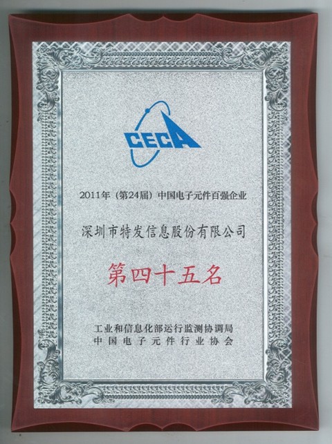 2011年7月11日,由工業(yè)和信息化部運(yùn)行監(jiān)測(cè)協(xié)調(diào)局、中國(guó)電子元件行業(yè)協(xié)會(huì)聯(lián)合主辦的 “第24屆中國(guó)電子元件百?gòu)?qiáng)論壇暨2011中國(guó)電子元件產(chǎn)業(yè)峰會(huì)”在北京召開(kāi),會(huì)上公布了第24屆電子元件百?gòu)?qiáng)企業(yè)名單并頒獎(jiǎng)。特發(fā)信息以綜合排名45名的成績(jī)?cè)俅诬Q身百?gòu)?qiáng)榜單,這也是特發(fā)信息自2008年以來(lái)連續(xù)第四次入選該榜單。