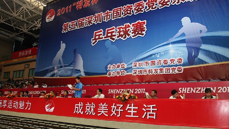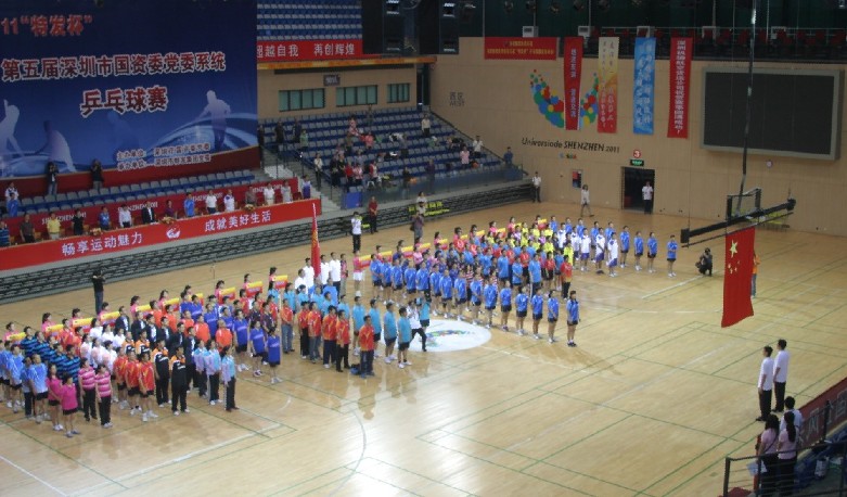 開幕式于10月29日上午8:30舉行。市國資委黨委書記柏立新,特發(fā)集團黨委書記、董事長劉愛群、黨委副書記、總經理施長躍,國資委黨辦主任李明、副主任張曉中、唐明通,以及國資委系統(tǒng)企業(yè)的領導出席開幕式。開幕式由集團總經理施長躍主持。此時的羅湖體育館一派歡快、濃烈的氛圍:主席臺正面高樹印有本次比賽徽標和“2011‘特發(fā)杯’第五屆深圳市國資委黨委系統(tǒng)乒乓球賽”字樣的巨幅背景板,四周掛滿國資委和系統(tǒng)各企業(yè)的旗幟與祝比賽圓滿成功的條幅,以及“暢享運動魅力,成就美好生活”、“樹競技風尚,展國企風采”等標語,各單位啦啦隊和觀眾坐滿看臺。伴隨著熱烈歡快的運動員進行曲,來自國資委系統(tǒng)21家單位的22支代表隊,在美麗端莊的引導員帶領下,隨著高舉國資委旗幟的旗手、護旗手依次入場,隊員們意氣風發(fā),精神飽滿,步伐矯健,隊列整齊。在全體起立奏唱國歌、莊嚴的升國旗儀式后,集團董事長劉愛群和國資委黨委書記柏立新分別代表承辦方和組委會先后致辭。