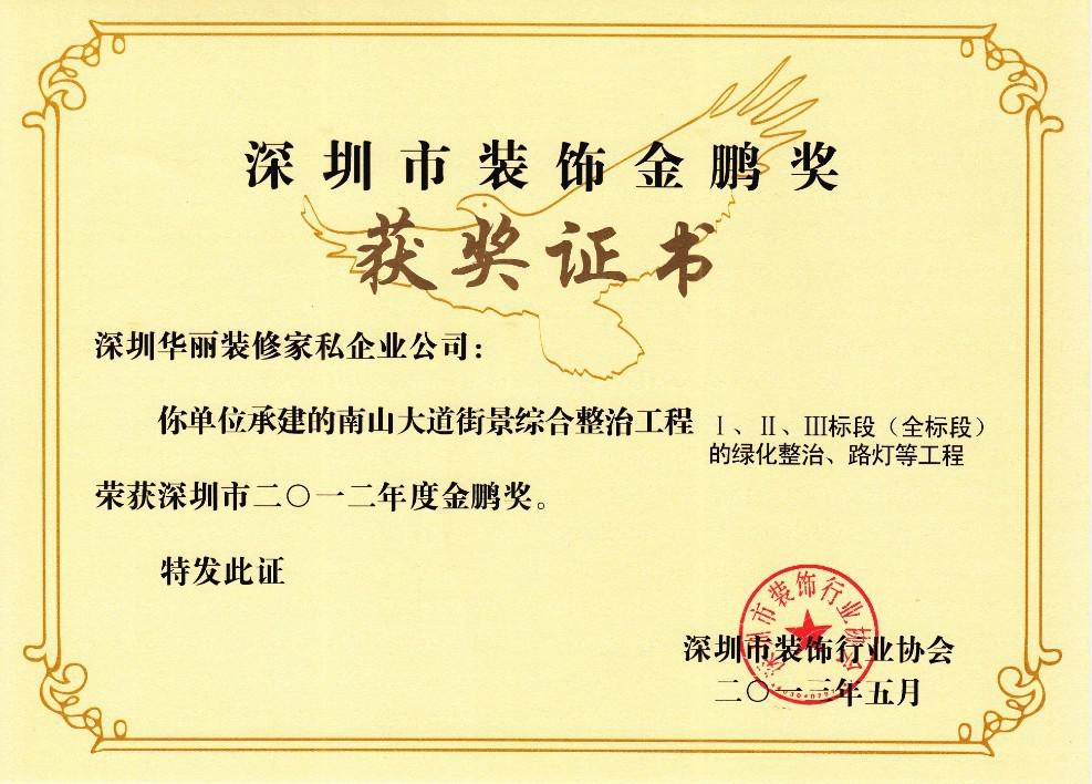 集團(tuán)參股企業(yè)華麗裝修家私企業(yè)公司承建的“南山大道街景綜合整治工程Ⅲ標(biāo)段”喜獲2012年度深圳裝飾工程金鵬獎(公裝類)。2013年8月,深圳市裝飾行業(yè)協(xié)會授予華麗公司“深圳市裝飾工程金鵬獎”獎杯和證書,這是華麗公司繼2002年以來第五次榮獲 “深圳市裝飾工程金鵬獎”。該獎是我市優(yōu)質(zhì)裝飾工程獎,也是我市裝飾工程市級質(zhì)量獎,根據(jù)《深圳市裝飾工程金鵬獎評選辦法》有關(guān)規(guī)定,深圳市裝飾行業(yè)協(xié)會秘書處組織專家對2012年度企業(yè)申報(bào)“金鵬獎”資料及工程現(xiàn)場認(rèn)真檢查評比,經(jīng)“金鵬獎”評委會評審?fù)ㄟ^,華麗公司榮獲此獎。