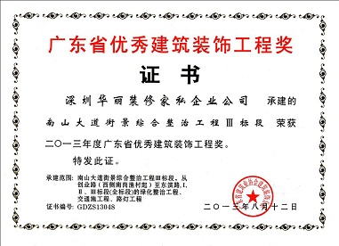 集團(tuán)參股企業(yè)華麗裝修家私企業(yè)公司承建的“南山大道街景綜合整治工程Ⅲ標(biāo)段”繼獲得2012年度深圳裝飾工程金鵬獎(jiǎng)(公裝類)后捷報(bào)頻傳,再一次榮獲廣東省建筑裝飾工程最高榮譽(yù)獎(jiǎng)“廣東省優(yōu)秀建筑裝飾工程獎(jiǎng)”(以下簡(jiǎn)稱“省優(yōu)”)。2013年10月廣東省建筑業(yè)協(xié)會(huì)建筑裝飾分會(huì)授予華麗公司“省優(yōu)”獎(jiǎng)杯、牌匾及證書。該工程經(jīng)深圳市裝飾行業(yè)協(xié)會(huì)的專家嚴(yán)格檢查評(píng)比之后擇優(yōu)推薦到廣東省建筑業(yè)協(xié)會(huì)建筑裝飾分會(huì),由省建筑業(yè)協(xié)會(huì)建筑裝飾分會(huì)組織廣東省內(nèi)的專家對(duì)“省優(yōu)”申報(bào)資料及現(xiàn)場(chǎng)進(jìn)行嚴(yán)格的考察評(píng)比,經(jīng)“省優(yōu)”評(píng)委會(huì)評(píng)審?fù)ㄟ^,華麗公司再次榮獲殊榮。